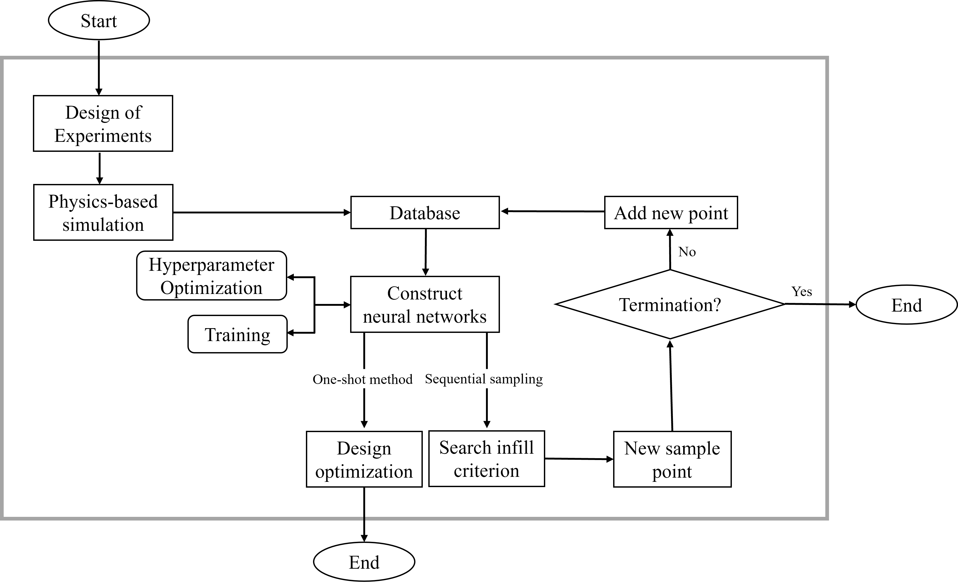 Basic elements of simulation-based engineering design optimization utilizing NNs as surrogate models are depicted in Fig. 3. It illustrates both one-shot and sequential sampling, which follow the same initial steps up to the construction of NNs. It begins with generating a design population, followed by physics-based simulations that evaluate corresponding outputs to form training data for the NNs. With this data, optimal HPs are determined to construct the NNs. These NNs replace the physics-based simulation to identify optimized designs in the one-shot method and discover new sample points based on the infill criterion in the sequential sampling. If a stopping condition is not reached, these new samples are integrated into the training dataset for future iterations.