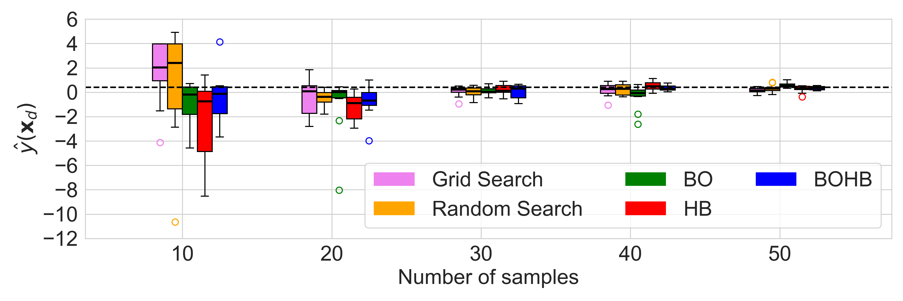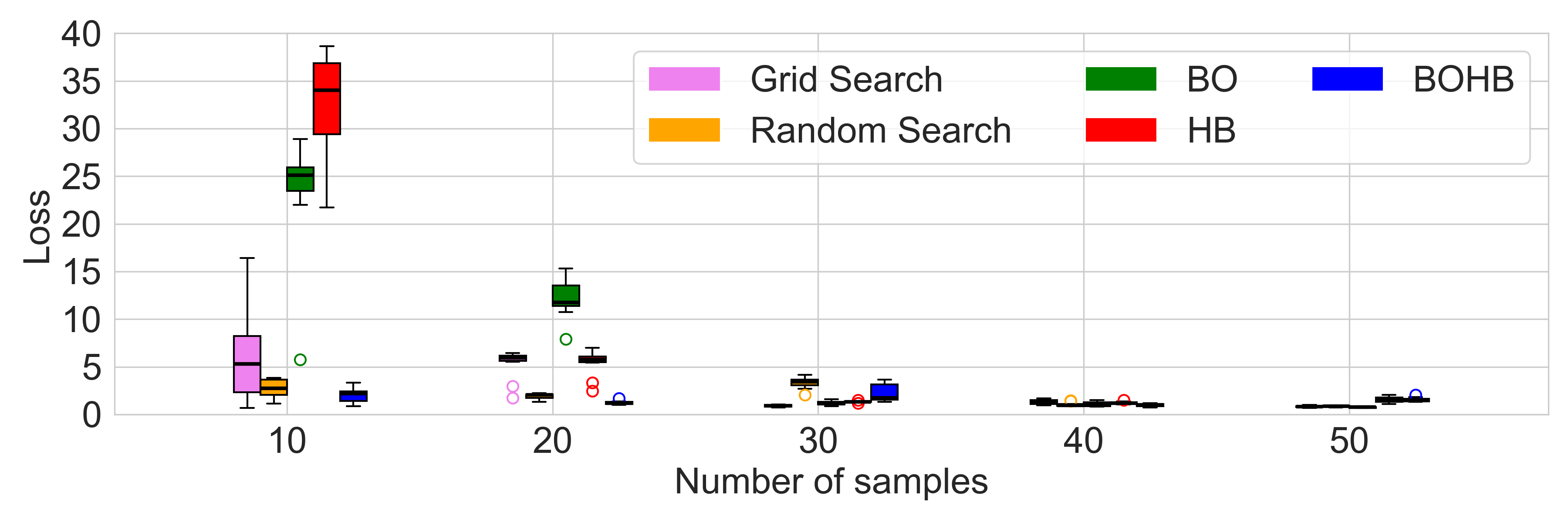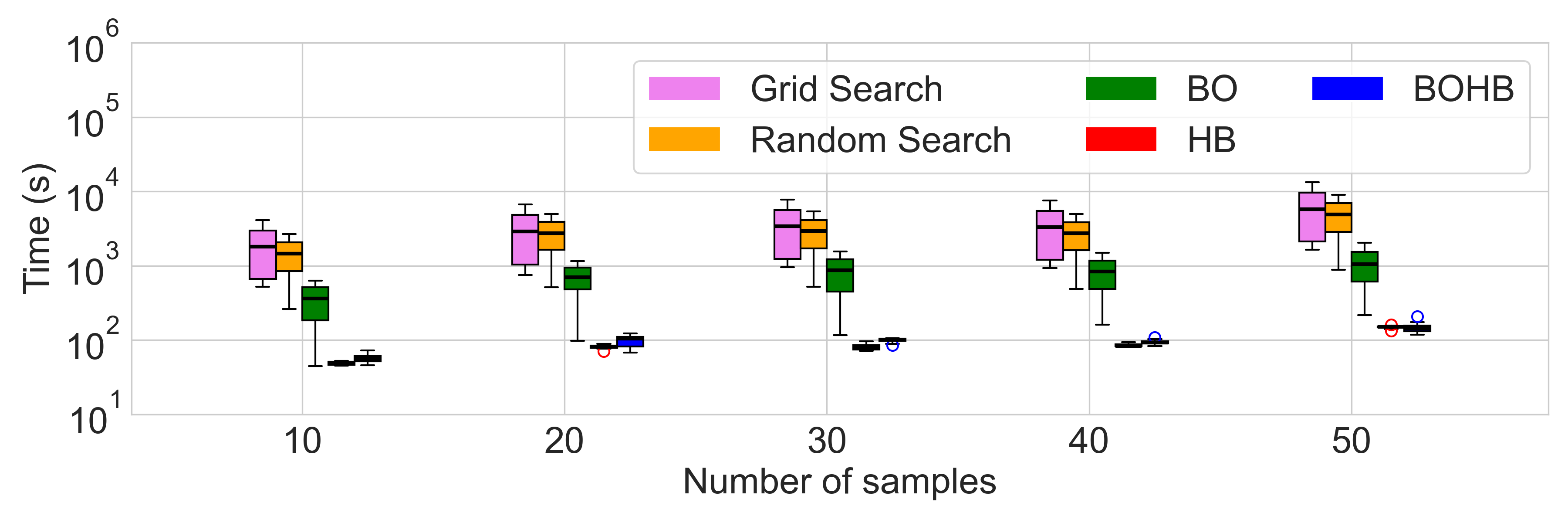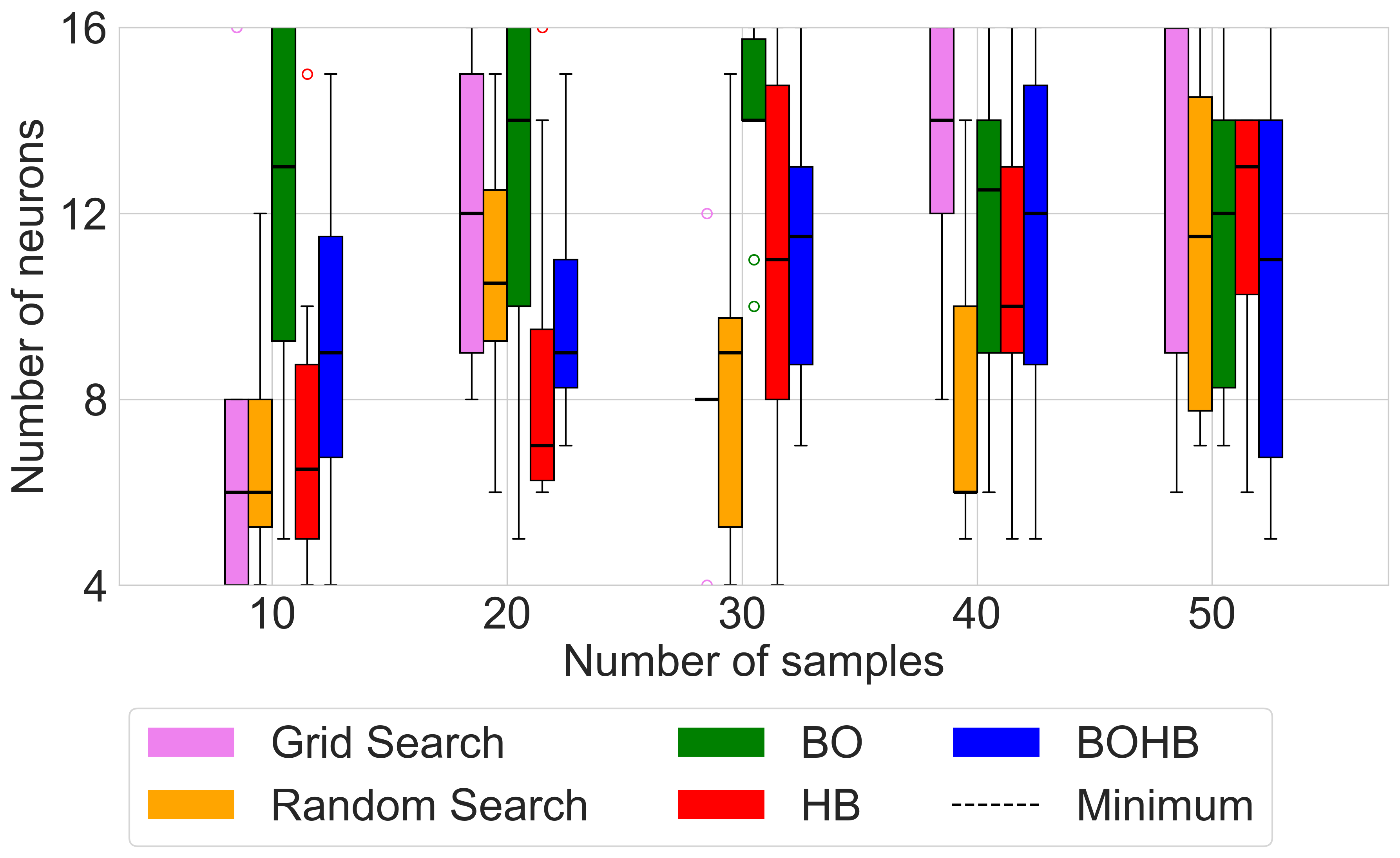 compare_Box.py: This script generates box plots to compare the performance of different HPO methods, tested ten times independently. It plots key metrics, including:Optimum found using the NN