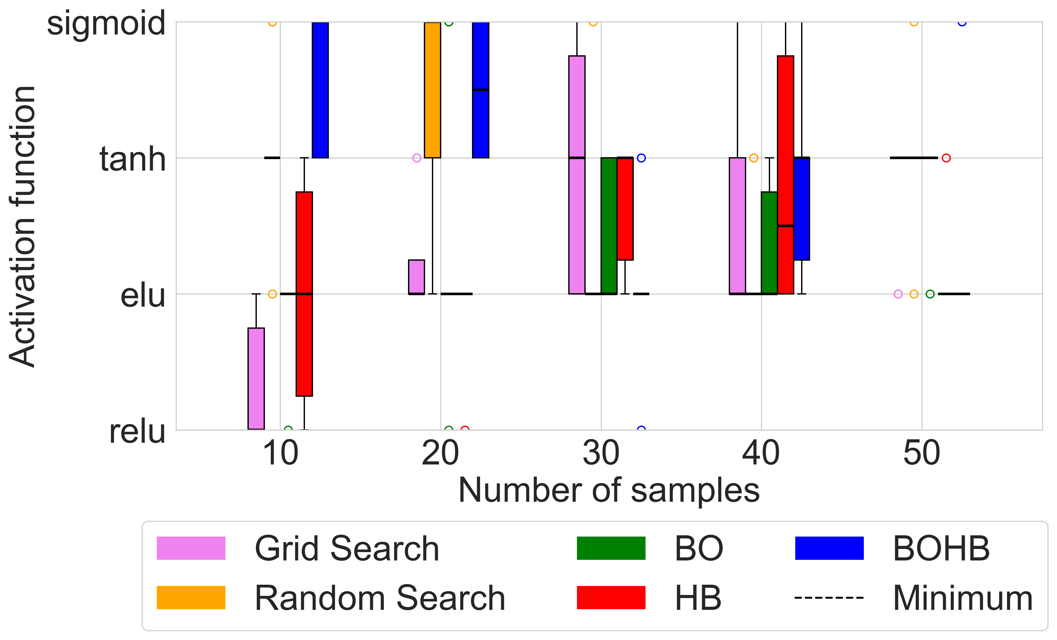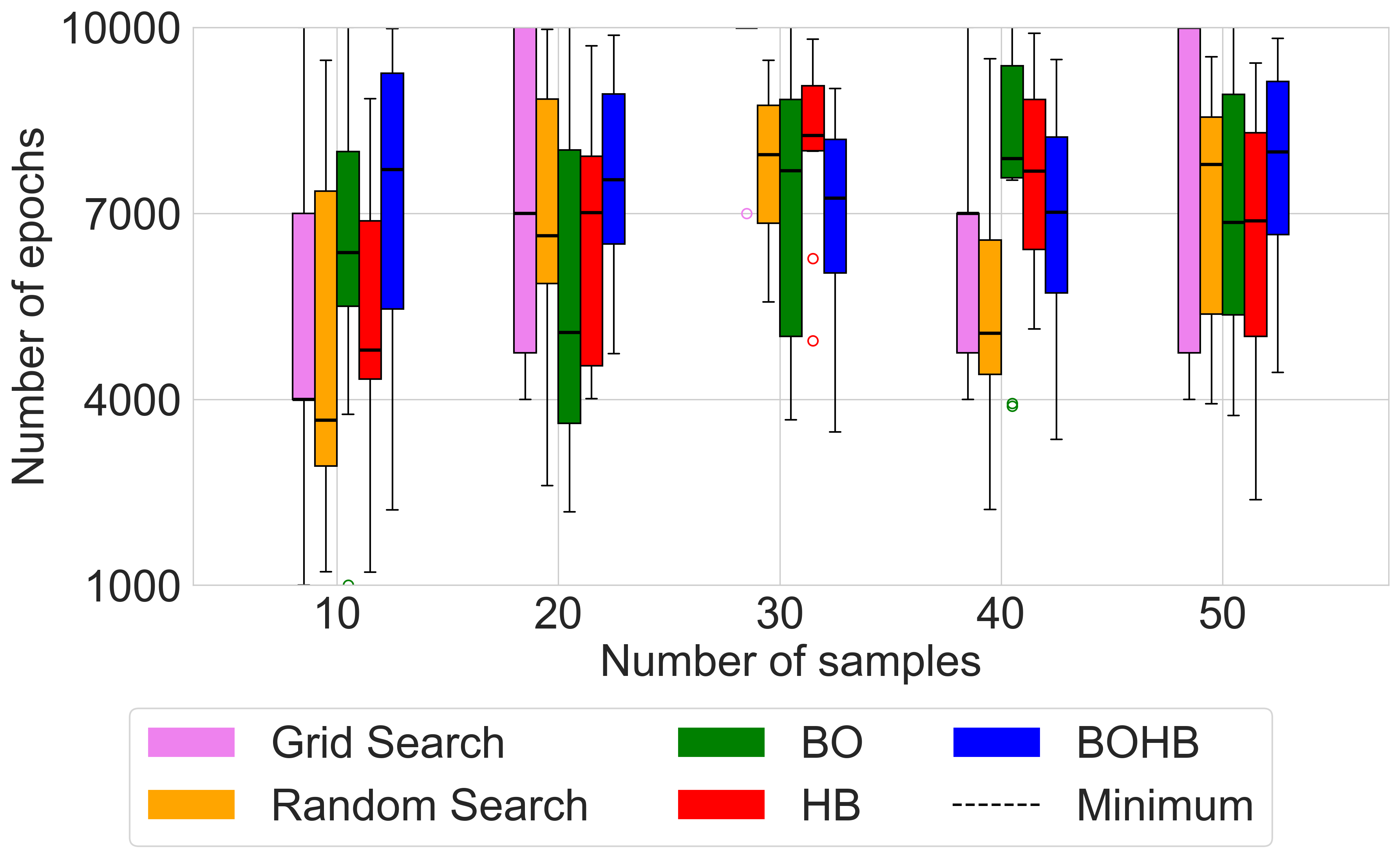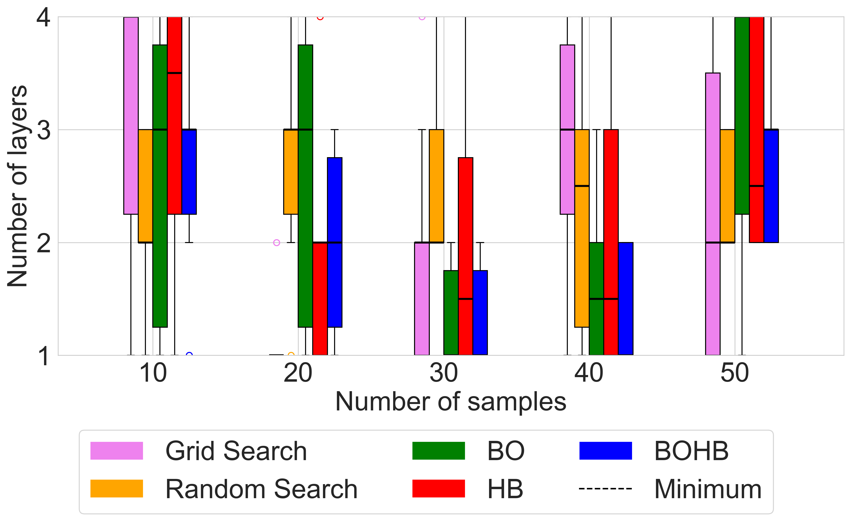The box plots created by both scripts allow for visualizing trends in the data by accounting for the randomness of NN behavior. These plots summarize the results of testing the HPO methods ten times independently.
