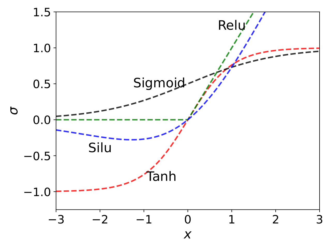 where \(W\) is the weight matrix (size is based on output and input size) and \(\mathbf{b}\) is the bias. The SiLU module represents your activation function. It takes an input and applies a nonlinear function elementwise. You can check here the list of various activation functions available in torch. You can also write your own activation function.