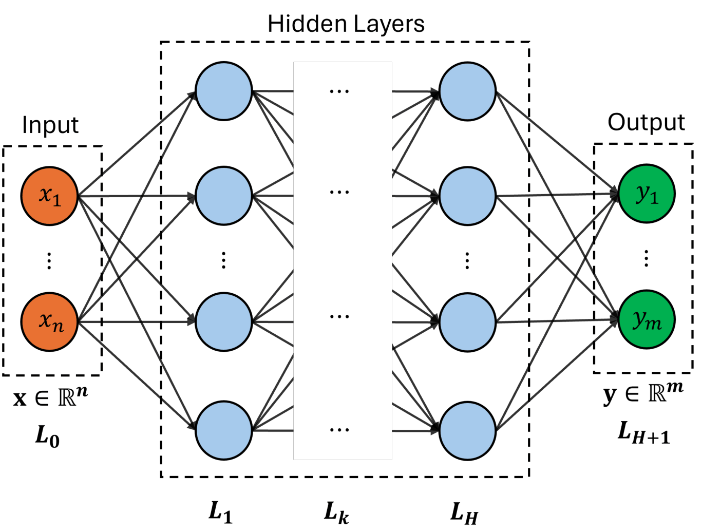 A neural network is a machine learning model inspired by the human brain, capable of approximating nonlinear functions through interconnected layers of computational units known as neurons. According to the universal approximation theorem, NN model with a sufficient number of layers and neurons can represent almost any function. There are many different kinds of neural networks but in this section we will be focusing on fully-connected neural networks (shown below), where each neuron in a given layer is connected to every neuron in the preceding layer.