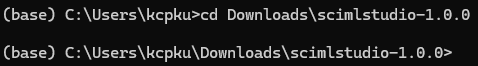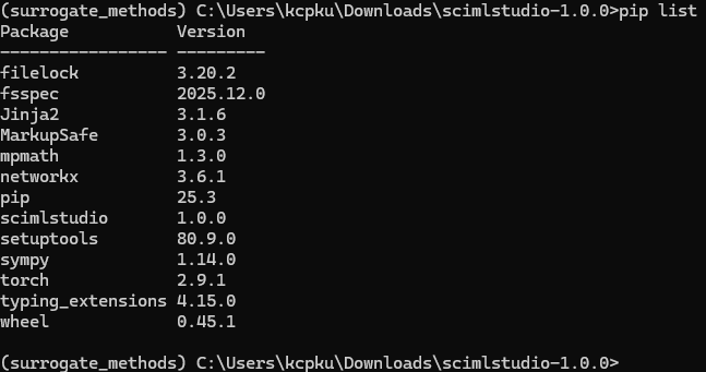Downloadsfolder. Then,cdcommand is used to navigate to the root folder. Once you are in the root folder, run the commandpip install .to install the pacakge. Make sure to include the dot after install. Once installed, you can runpip listagain and see that the scimlstudio package is now installed in your environment.